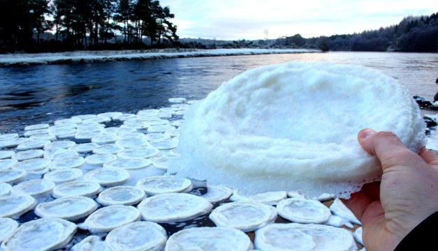 Description: sebuah keanehan terjadi di skotlandia. Sebuah sungai disana tiba - tiba muncul piringan es. Kejadian ini mungkin terjadi karena fenomena alam tertentu yang nantinya bisa dijelaskan secara ilmiah. Akan tetapi kemunculannya tetap misterius. orang disana menyebutnya sebagai mysterious ice pancakes. gambar ini bersumber dari (Jamie Urquhart/CNN)